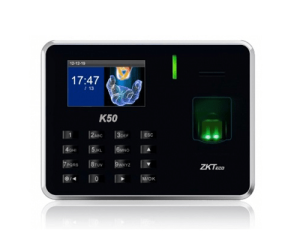 Máy chấm công vân tay ZKTeco K50 là dòng máy chấm công bằng vân tay và thẻ cảm ứng với tốc độ nhanh và rất chính xác. K50 có màn hình 2,8 inch TFT hiển thị nhiều thông tin một cách sinh động, bao gồm cả chất lượng hình ảnh dấu vân tay và kết quả xác minh, giao tiếp TCP / IP là tiêu chuẩn và tích hợp thêm pin lưu điện sử dụng trong khoảng 8 tiếng. Có tích hợp thêm tính năng hẹn giờ tắt/mở máy mang đến tín an toàn và tiết kiệm điện khi sử dụng.