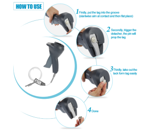 Đầu tiên, đặt tem từ trên quần áo khớp với đầu tháo tem. Khi tem từ đã khớp với đầu tháo tem thì bóp chặt tay cầm phần nẫy bên dưới là tem từ được tách khỏi quần áo.